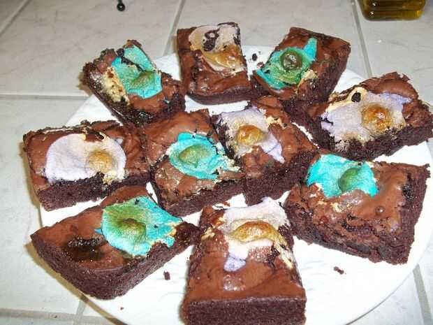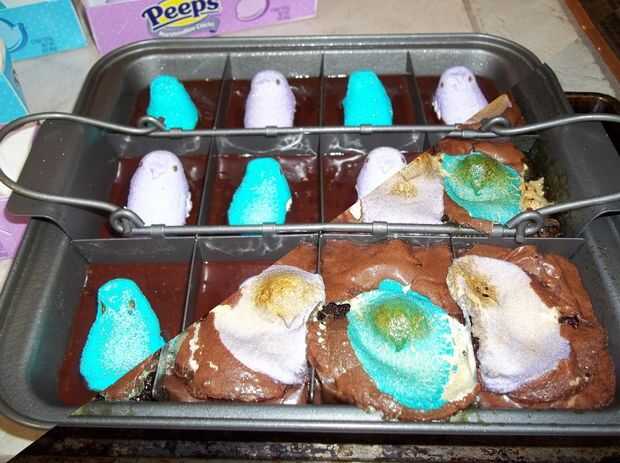 Decidí hacer brownies para Pascua postre. Como mezclé la masa, comencé a pensar en cómo hacer los brownies más festivo. Tengo varios tipos de sprinkles y fue a por mis cosas para hornear a decidir cuál utilizar cuando la raíz mis pensamientos a esas grapas espolvoreado de azúcar de la cesta de Pascua americano: se asoma. Pensé que iban a ir bien en los brownies. Consideré los Peeps de corte con unas tijeras de cocina y empujar piezas a la masa. Sin embargo, cuando pregunté a mis hijos si donarían sus píos a la causa y mi más joven sugirió que shove píos todos a la masa. Lo hice y esto es lo que sucedió.