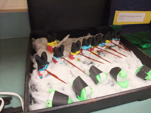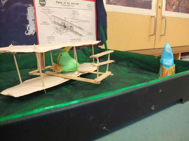 Los ejemplos fueron construidos por un estudiante de cuarto grado y un estudiante de quinto grado. El primero es un diorama de un bastante bien sabe la foto del primer vuelo de los hermanos Wright. Se puede ver que Orville y Wilbur Peep son ambas etapas ya estaban en la foto y el planeador de Wright fue construido a partir de dibujos originales. El segundo ejemplo se basó en el famoso grabado de Paul Reveres de la masacre de Boston. Colocación cuidadosa de la situación de coronel Preston detrás de sus tropas, como se muestra en el grabado, obtuvo puntos extras.