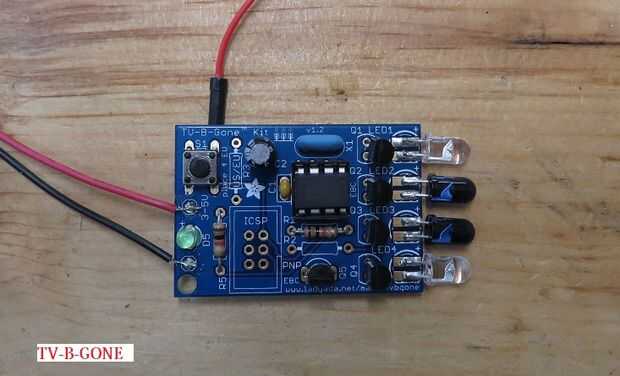 La Asamblea de TV-B-Gone es un circuito independiente que escupe cientos de remoto "off" las señales de TV. La manera en que opera en la Mark II es que el arduino está conectado al botón de fuego. Así que cuando usted presiona el botón en la pantalla, es lo mismo que presionar el botón en el dispositivo TV-B-Gone.