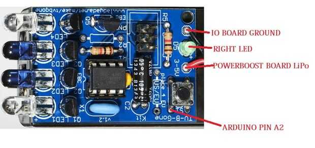 El LED no necesita una resistencia de 1 k. Además, no puede compartir el terreno para este LED. DEBE ejecutar los cables positivos y negativos de la placa de tv-b-gone en su LED. Es necesario quitar el LED original de la tarjeta de tv-b-gone. O no instalarlo como este es comprado como kit que tienes que poner juntos.