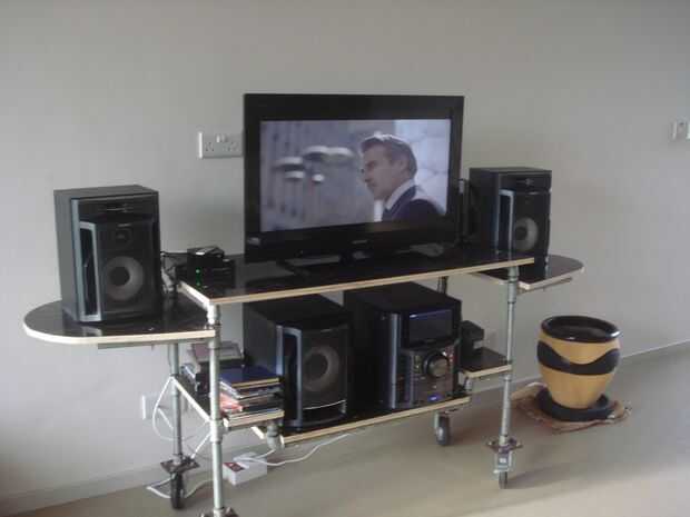 Necesitaba un lugar para poner mi estereo y mi tocadiscos. Busca en tiendas de muebles diferentes, no pude encontrar nada que parecía que tenía en mente. Así que decidí hacer mi propio.Materiales2 x falta de IKEA mesasbarras roscadas de 2 x 1m M1816