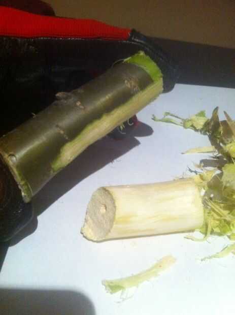 La madera que utilicé era de un árbol en el patio de mi casa. La madera era muy verde, y no recomiendo esto ya que es más difícil de perforar y tallar. La madera que utilizamos no pueden tratarse con cualquier cosa como grado 2x4s. son tratados con productos químicos que usted no quiere fijar en el fuego. Asegúrese de que la madera es lo suficientemente gruesa como en diámetro que un cuenco de pipa razonable perforado en él. Cortar la madera en dos trozos. La más gruesa de las dos será la taza de la pipa, y el disolvente será el tallo.