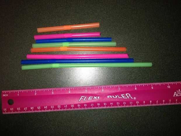 Medida y corte la paja a estas longitudes: pulgadas 7,7 6,7 pulg., 6,1 pulg., 5,7 pulg., 5,1 pulg., 4,5 pulgadas, 3,9 pulg., y 3,7 en. Corte a 7 separadores de 1 pulg. de largo.