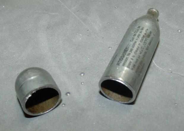 Estos cartuchos tienen recubrimientos de zinc en el interior y exterior para evitar corrosión y no queremos nada de eso en nuestro tubo, sólo queremos el acero industrial sin recubrimiento llano. Tomar la taza de metal y calor para un buen cinco minutos en una llama de gas, utiliza un quemador en un campamento de la estufa. Esto quemará la capa. Apagan en agua para flash fresco y hervir cualquier residuo de grasa o char.