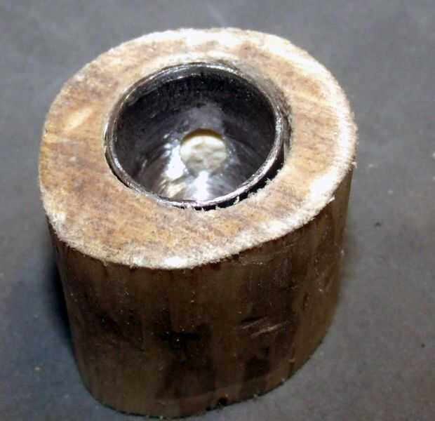 Sentarse de la taza de metal en la madera. Los bordes de los dos tazones de fuente deben alinearse perfectamente. Si no, moler hacia fuera el recipiente de madera más, o estar preparado para añadir a espaciadores cuando pegue más adelante.