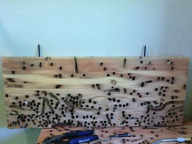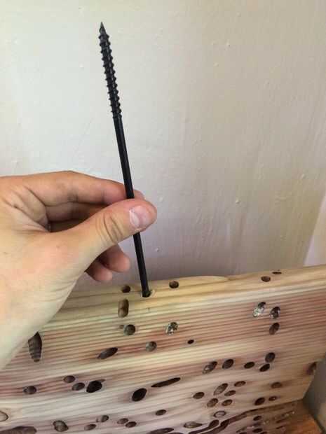 3. Con brocas progresivamente más grandes, agujeros de taladro en el estante de al lado hasta que tenga un agujero ligeramente más grande que el diámetro de los tornillos para madera de 8" y ~ 6" profundamente en la madera. Puede que necesite comprar una broca larga para este propósito; Compré un 1/4 "x 6" de bits.