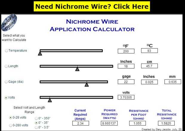 Nicromio alambre uso calculadora Web utilizado : http://www.jacobs-online.biz/nichrome/NichromeCalc...