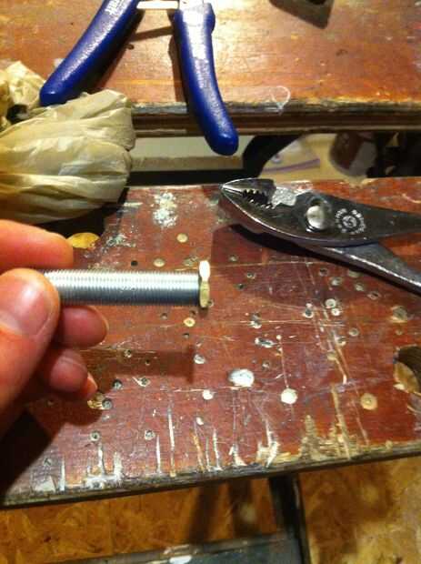 Después ya tienes tu orificio perforado, primer roscar una tuerca en uno de los extremos de la varilla para asegurar una longitud de barra de la lámpara para el aislador, deslice a través del agujero en el aislante del interior y luego fijar otra tuerca en la parte superior de la parte exterior del aislante. Sólo apriete hasta que quede ajustada... No quiero romper o agrietar su aislador hermosa!