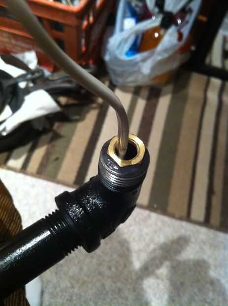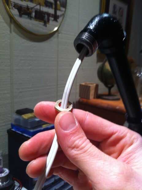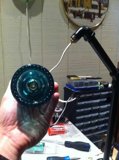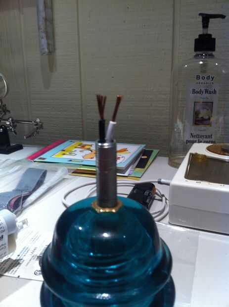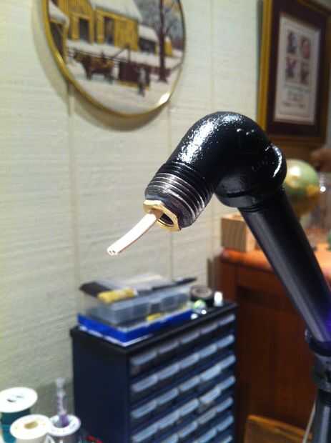 Asegure el aislador de vidrio hasta el codo 90 grados roscar la varilla de la lámpara en la tuerca que pega en el codo. Usé un poco de Loctite para mantener el aislador rosca de lámpara barra apretado. Al mismo tiempo, el reductor de acoplamiento en el tornillo.