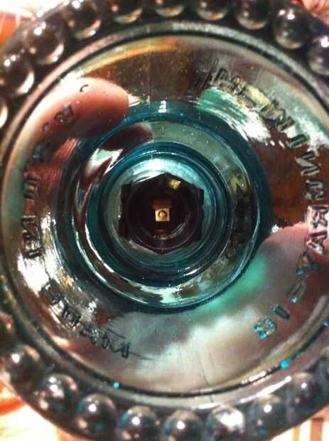 Ahora fije su zócalo de candelabros base para el vidrio aislador y pase los cables por el agujero que ha perforado. Que encolarla con epoxy o caliente pegamento si lo desea. Compré uno que tenía una especie de resorte lengüetas en los lados para mantenerla en su lugar.