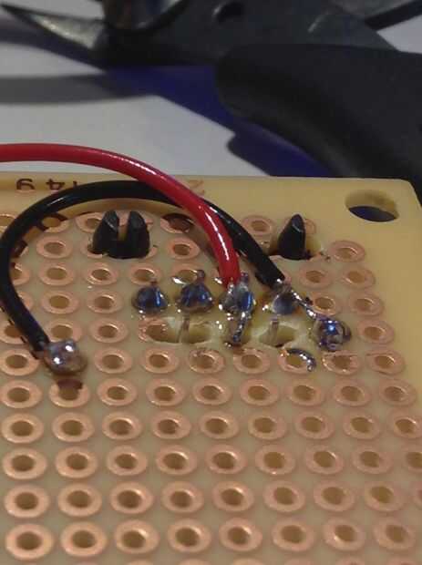 La siguiente etapa es los cables de entrada del convertidor a la toma RJ45. Esto se hace mejor siguiendo la foto: la última fila de pines en el socket son números 1,3,5,7 (de izquierda a derecha), y la primera fila son 2,4,6,8. Usted necesitará conectarse ambas patillas 4 y 5 del convertidor + V entrada y 7 y 8 -V (o tierra) de entrada. Estos son el rojo y negro los alambres, respectivamente, en la foto.