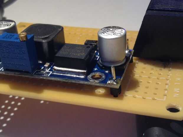 Ahora puede montar el módulo del convertidor DC-DC en el tablero. El que compré tenía su entrada y salida de conexiones en las esquinas, que me dejaran con cuatro pines Molex (ver foto). Ponga los pasadores en lugares adecuados en la placa del pad, luego baje el módulo abajo sobre ellos y soldar la parte superior de cada pin en el módulo. Girar todo y la parte inferior de cada pin a la Junta del cojín de la soldadura.