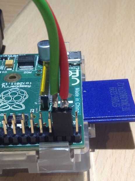 Para cualquier modelo, los pines 4 (+ 5V) y 6 (tierra) son puntos de conexión adecuado. Usé un simple pin 2 0,1" zócalo (Multicomp 2212S-02SG-85 de http://cpc.farnell.com) conectado como se muestra en la foto: el cable rojo es + 5V y el verde es tierra. Puede proteger las conexiones con mangas de encogimiento de calor o una gota de silicona.