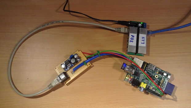 Ahora puede montar todo el sistema. Del lado de 'entrada' del inyector PoE (marcado ' LAN' en la foto) se conecta a un concentrador de red / router. El lado de 'salida' se conecta a la board de splitter vía un cable de red (generalmente se trata de mucho más tiempo, por supuesto). El RJ45 plomo enchufe y alimentación de la placa del separador ir a Pi - doble Compruebe la conexión a la cabecera GPIO antes de encender.