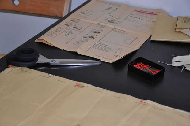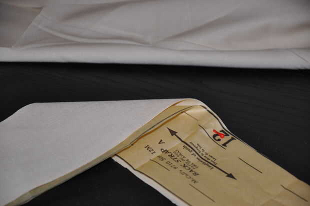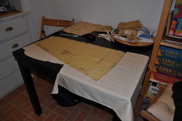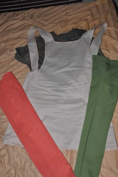 No hice ninguna guarnición o interfaces ya que era sólo para Halloween. Así el patrón consistió en cinco piezas para trabajar con. El frente, dos correas y la parte trasera en dos piezas. Para la diversión, solía hilo naranja en un lado del puente y verde por la otra, corresponden a las polainas.