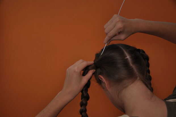 Pegúelo en a través de la carpeta de pelo al lado de su cabeza. No es divertido o sensación muy agradable, pero a continuación, deslícelo dentro de la trenza. No va a cooperar enteramente, sino sólo intentar conservarlo como ocultas en el cabello como usted puede conseguir.