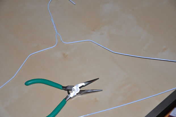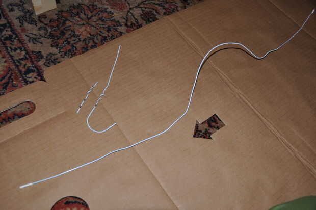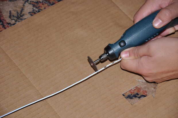 Tome un gancho y enderezar hacia fuera. Cortar uno de los extremos torcidos. He utilizado una dremel. Tomar su suspensión y doblar alrededor de su cabeza. Tuve ayuda de mi marido. Sobre todo intentar poner una curva en ella así que descanse sobre tu cabeza y sobresalen a los lados en el sobre donde comienzan las trenzas. (que tendrás que conseguir tu pelo atado y trenzado para contar esta parte) Conjeturado sobre cuánto necesitaría sobresale a cada lado, midiendo hasta las trenzas una vez tuve mi pelo hecho y luego cortar el exceso. Creo que es mejor tenerlo un poco demasiado corto de que sobresalga el extremo de sus trenzas. Pongo algunos toque de enmascarar alrededor del extremo de la percha para que no apuñala me cuando le pongo más tarde.