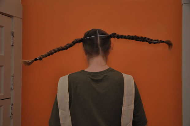 Después se corta, dejar a un lado y trabajar en su cabello. Hacer dos coletas a los lados de su cabeza así que son bastante incluso con los demás. Luego de la trenza.
