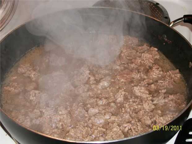 En una sartén grande hervir hamburguesa y salchicha en aproximadamente 2 tazas de agua en medio-alto. Cuando empiece a hervir convertir calor a medio y cocine durante unos 30 minutos.