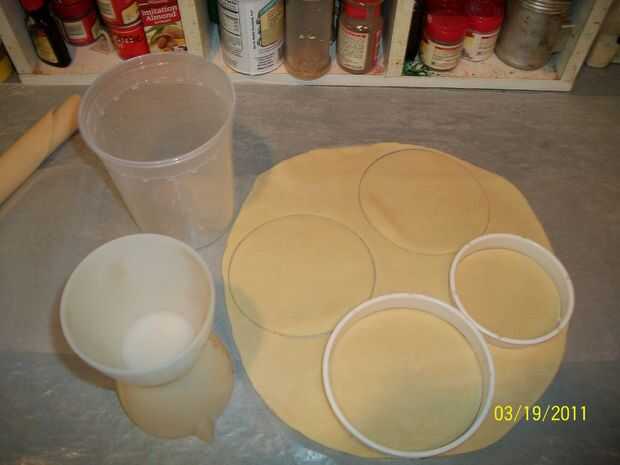 Estirar la base de tarta. Use cualquier tartera o recipiente para hacer el tamaño deseado. He utilizado una herramienta de rotación, es de 5 pulgadas de diámetro. Solía hacer mi corteza pero después de fracturar la muñeca hace unos años tenían que ir la ruta fácil y ahorra tiempo.