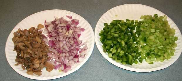 Picar apio, pimiento verde, cebolla, champiñón y lugar en recipiente adecuado para microondas. Cocine en alto unos 10 minutos.