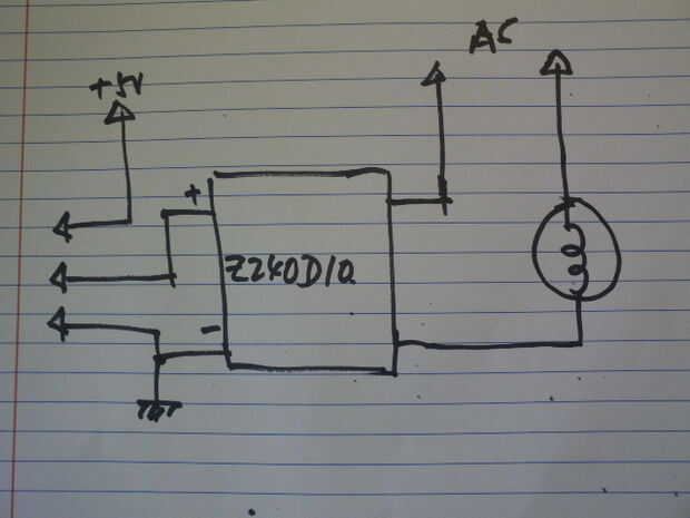 Control AC luz, que utilicé un modelo de relé de estado sólido Z240D10, el esquema como se muestra, la carga de AC es simplemente en serie. Por supuesto usted no puede tener esto, si se sigue se puede utilizar un relé de estado sólido no con controlador transistor como se muestra, la mayor precaución es el poder del punto en el relé de carga como son conexión de CA. El circuito PIR o relé necesita alimentación de 5V, puede considerar usar un cargador de teléfono móvil raspada.
