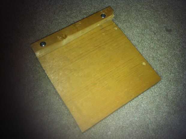 Tome el pequeño pedazo y lo puso en el borde a la grande. Perfore dos agujeros guía de 1 cm del borde. Coloque los tornillos en los orificios y apriételos. Perfore un agujero en el centro de la pieza pequeña del tamaño de un lápiz