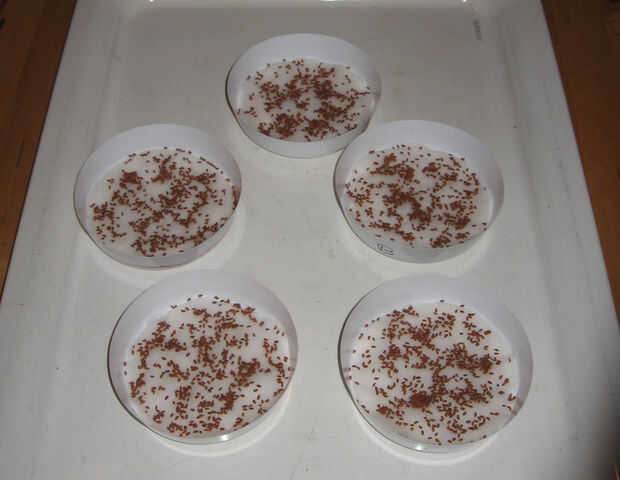 La primera prueba hice involucrados semillas de berro. Me puse sobre 100 semillas en cinco copas (marcadas) idénticos, llenadas de lana de algodón. Tres tazas donde el agua de las 3 pirámides diferentes, los otros dos eran tazas de control y alimentados con la misma agua que se almacena en la misma habitación que las pirámides, pero no guardó debajo de la pirámide.