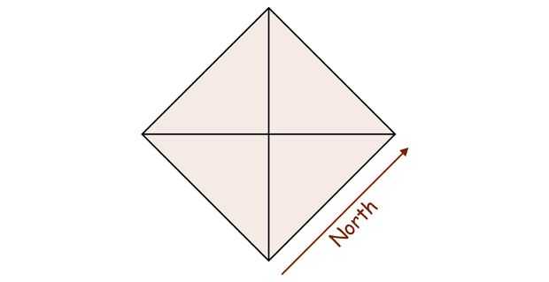 Lo primero que tienes que hacer, se pone la pirámide en ángulo recto. Dos costillas de la base de la pirámide deben ser paralelas a la línea de norte a sur de una brújula. Arriba se muestra una ilustración. Esto es también exactamente cómo la pirámide de Keops está orientada.