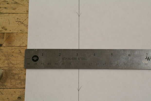 Vamos a comenzar con una línea que es paralela al borde de nuestro papel. Cerca a un extremo del papel Mida desde el borde del lado largo por 3 pulgadas y marca una flecha como se muestra en el cuadro 1. Realmente no importa donde usted está a la izquierda o la derecha, siempre y cuando mide hasta 3 pulgadas. Hacia el otro extremo del papel, marca otra flecha hacia arriba desde el borde inferior 3 pulgadas. Ahora Alinee la regla con las puntas de las flechas y rayar la línea como se muestra en el cuadro 2. Es útil para hacer la línea más de lo necesario, tan sólo tienes que ir por todo el papel.