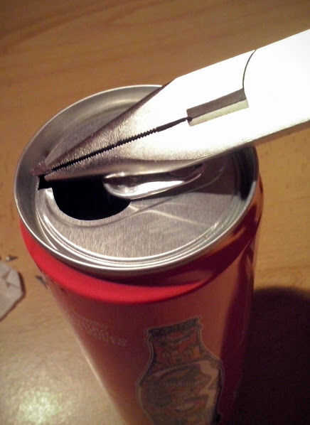 Pinzas funcionan mejor, tanto para cortar piezas y para aplastar los bordes afilados resultantes al lado. Trabajar en ello hasta que estés satisfecho, es decir, para estar razonablemente seguro de que nadie pierda la piel de los dedos durante el uso previsto de los titulares. Convirtiendo los filos hacia el exterior es mejor que hacia el interior.
