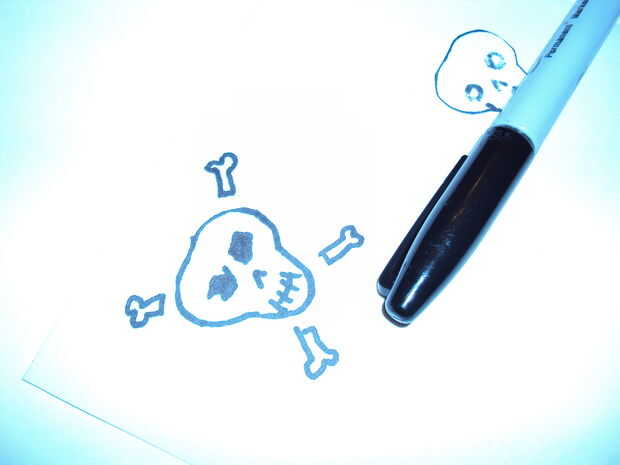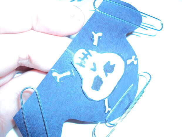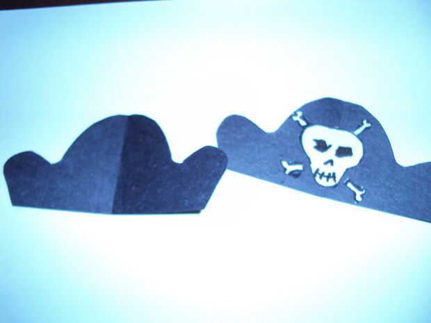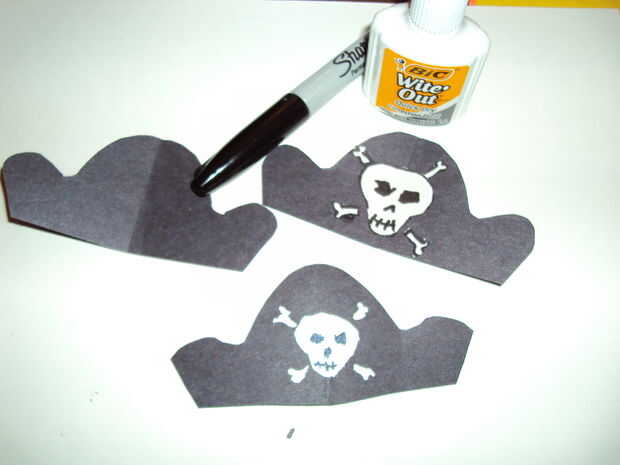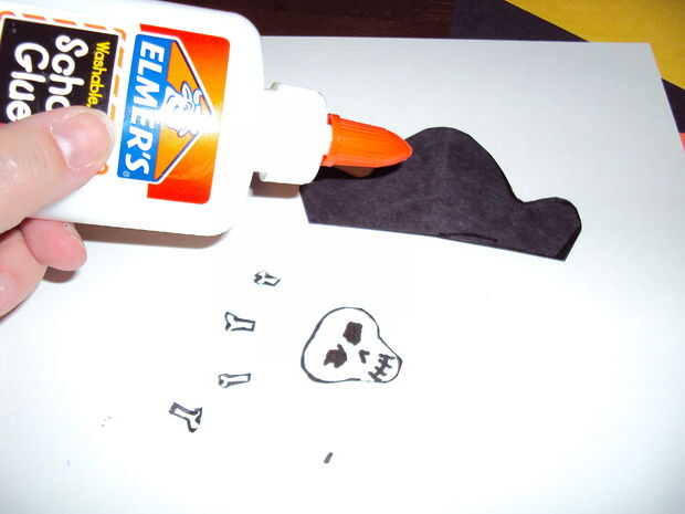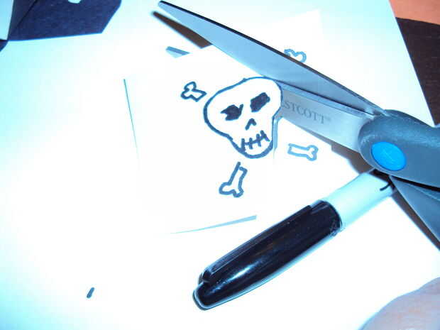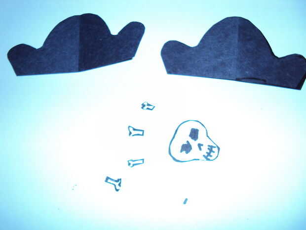 Una vez que tengas tus dos piezas de sombrero de cortan los huesos del cráneo y la Cruz. No hay ningún problema en dar gratis esto si quieres. Puede recortar los ojos o dibujarlos en. En una alternativa que podría pintar en la calabera... usted puede hacer esto con pintura blanca o whiteout (whiteout FYI es SMELLY! El uso en un área bien ventilada)