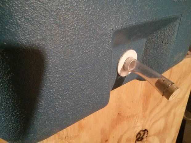 Coloqué el enfriador en el cuadro inferior y con las piezas de desagüe quitadas empujé un marcador a través del orificio de drenaje para marcar donde se alinean con la caja. Este es donde perforado el agujero para el desagüe pasar a través.