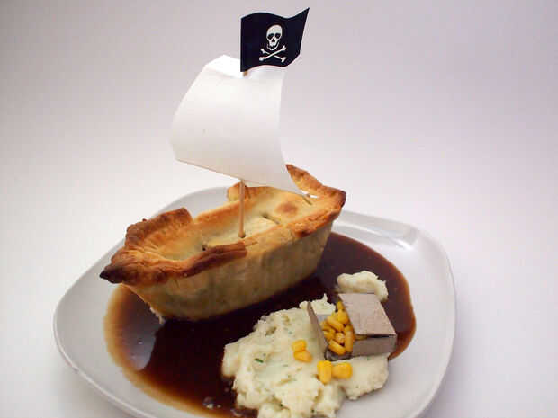 Tarta de pirata es una pasta sabrosa cena formada para parecer un barco pirata. Esta receta de tarta puede ser adaptada para una tarta de postre dulce, como este tipo de tarta de manzana como un barco pirata que basé mi diseño de. En lugar de un pastel dulce, quería una tarta de carne abundante y pensé que era un truco fácil para completar la escena pirata y tiene un mar de salsa, y una isla de puré de patatas completo con tesoro dorado.