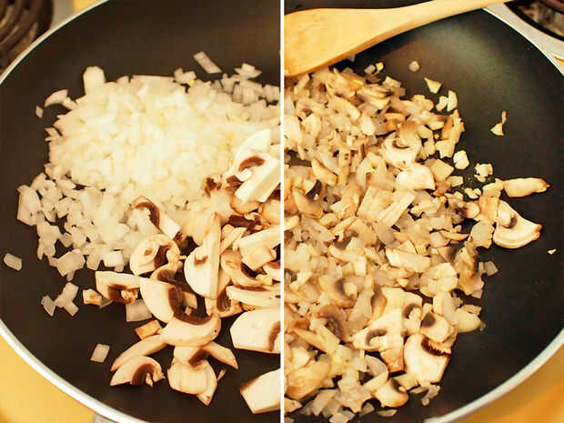 Ajo y la cebolla en cuadritos y combinado con champiñones picados en una sartén sobre fuego alto. Saltear hasta que las cebollas estén transparentes. Retirar de la sartén y reservar.