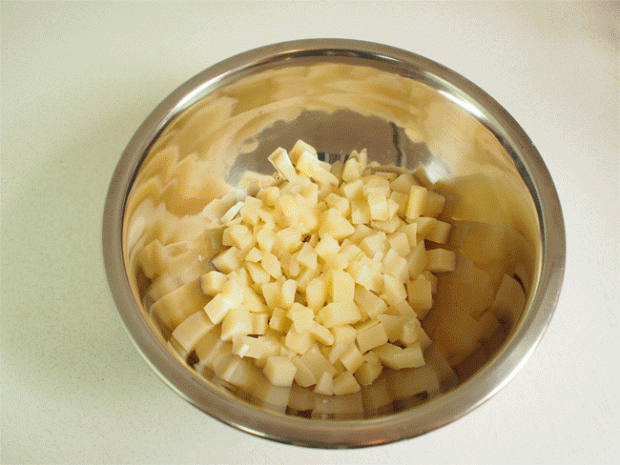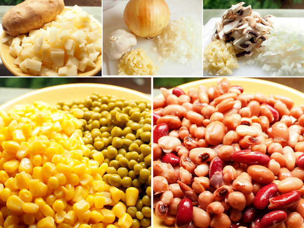 En un tazón grande mezclar cebollas salteadas, ajo y champiñones, papas escaldados, carne cocida, con cualquier otro ingrediente que puede que desee agregar. He incluido maíz, guisantes y una fiesta de frijoles.