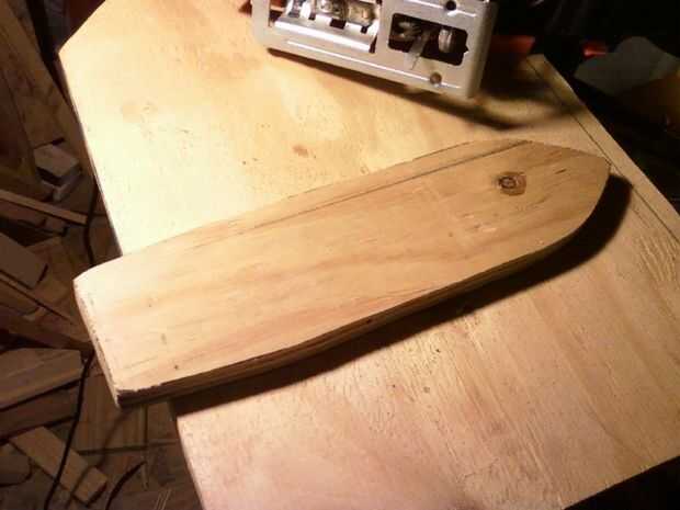 Entonces, remonta a la primera pieza otra vez, pero esta vez corta la pieza en un ángulo de 15 grados. Después de la segunda pieza fue cortar, remonta su parte inferior en la madera una vez más, esta vez de corte en un ángulo de 45 grados. Así, cuando las tres piezas se apilan uno encima del otro, parece haber una curva, al igual que la de un barco. La lija para suavizar los ángulos viene más adelante.