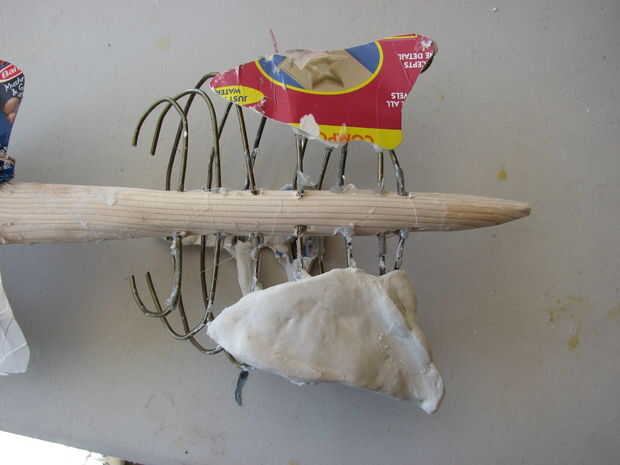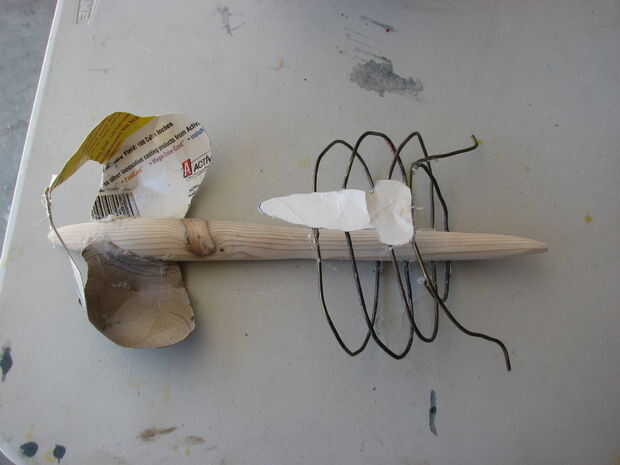 Un títere operado por la cadena con los ojos y los párpados móvilesEquipo:-Una cara en papel maché, papel maché-4 pelotas de ping pong-alambre-2 palillos de dientes-banda elástica 2-cadena-2 trozos pequeños de madera o plástico-1 Cruz de madera-4 aro