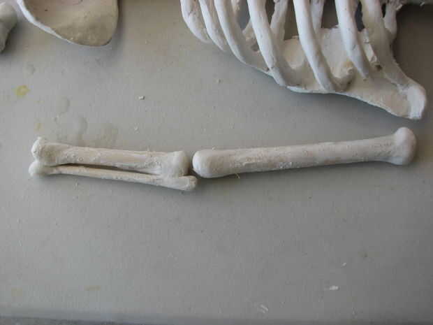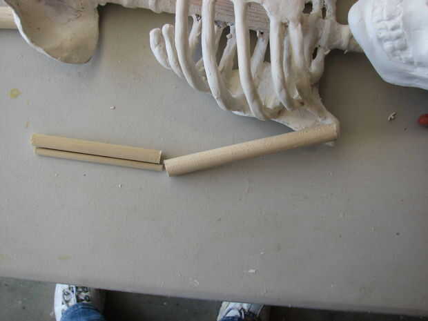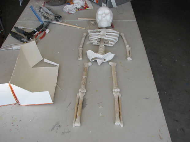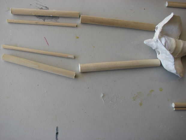 Brazos y piernas se hacen de diverso tamaño esviados. Añadir arcilla de papel a enclavijar para que se vean más como huesos. Añadir ojos tornillo de enclavamiento en los codos y las rodillas. Arena y pintura.