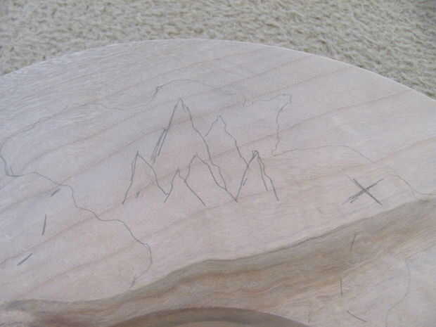 Miré en muchos mapas y se inspiró para los diseños. He encontrado cosas que quería incluir como barcos, tiburones, compás y palmas. Con esto he creado un bosquejo que luego cambió un poco pero lo suficiente para empezar a hacer planes. La razón principal de que esto cambió fue la madera. Con el grano de la madera, se trata de un lienzo que puede dictar donde las cosas van en su diseño. Hubo 2 características que afectó a mi diseño. Una sección de la figura alta y una pequeña raya color. La figura parecía áspero de las aguas por lo es donde coloqué los tiburones. Trabajé todo el color raya y convertirlo en parte de la isla. A partir de ahí todo lo demás, pongo a dibujar con lápiz.