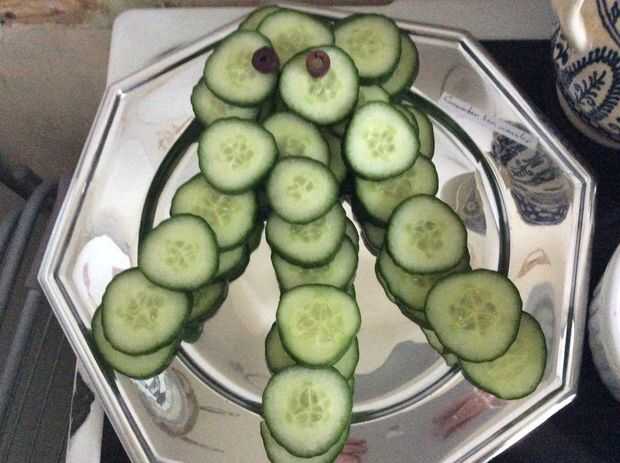 Extienda el pepino en forma de monstruo de mar y tomar un oliva de blake, a la mitad, para los ojos.