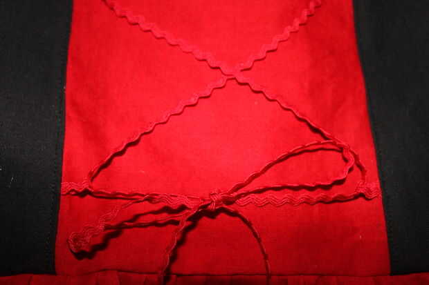 este es un vestido de estilo medieval que hice para mi clase de historia de 7 º grado. Empecé con un patrón de vestido de halloween y modificado para adaptarse a lo que quería. Usé una costura para hacerlo. En la parte posterior tenía que crear un co