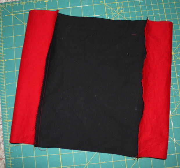 Panel de lugar negro, derecho lados juntos, a que panel y coser por el lado. Acabado con un zig-zag. Hacer lo mismo con el otro panel negro en el otro lado.
