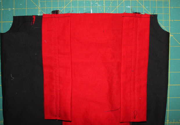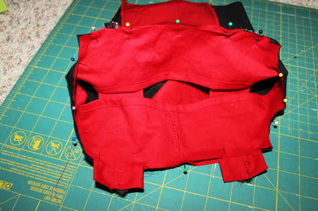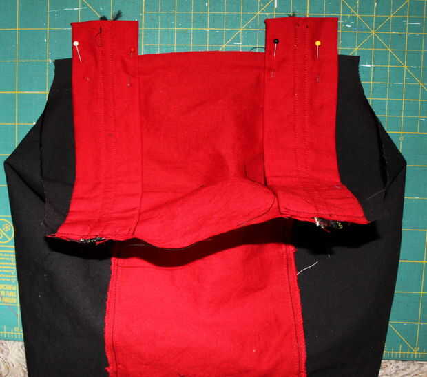 Ahora, las correas. Los PIN que hay suficiente espacio para un margen de costura de 3/8-1/2" al lado de las ranuras del brazo. Yo sólo alineados al borde de mi corte con el borde de mi panel frontal para facilitar mi vida.