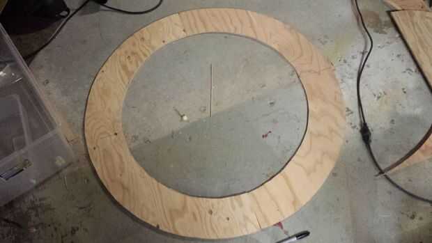 Una de mis herramientas caseras es un palillo de la yarda con un clavo en un extremo y los orificios perforados en incrementos de 1" por el centro. Esto permite hasta 3' perfectos círculos. Usé esto para trazar círculos de 4 cuartos que minimizar desperdicio de material. Luego se cortó con una sierra de calar.