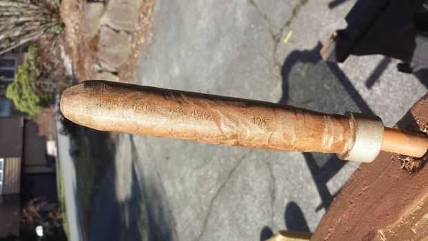Manejar monta - siguiente fue además de los montes de mango. Solía un pedacito de madera con una punta de pala agujeros alrededor de la circunferencia. El tamaño del agujero fue emparejado el diámetro de la tubería de PEX que se utiliza para unir las asas (ver fotos). Una longitud de PEX fue cortada y los agujeros fueron perforados para permitir que el pegamento gorila se filtre a través de la superficie del extendido y secado, bloqueo en su lugar.