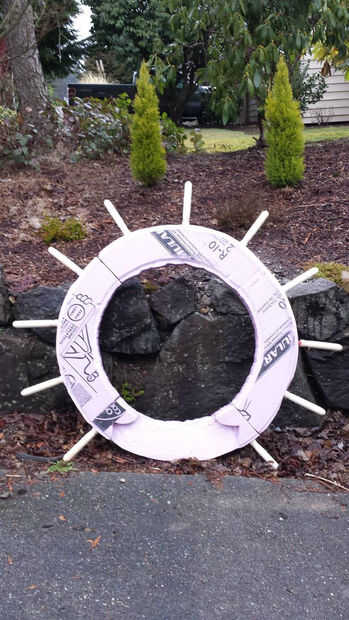 Para cumplir con estas especificaciones planeaba 2 capas de 2" densa espuma rosa a una 1/4" madera contrachapada forro del pegamento. La rueda se construirán de secciones de cuarto 4 que se atornille a través de enganches en la superficie posterior. Los mangos se deslicen en vía un post en orificios de diseño para minimizar el tamaño y permite un transporte fácil.