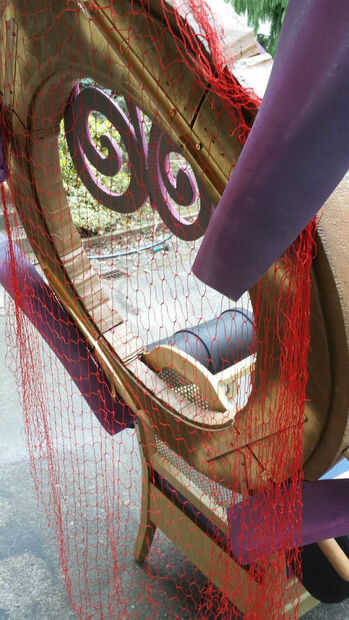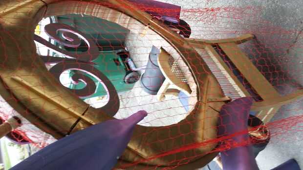 Montaje - quería que la rueda a la transición en la silla así que la mitad de espesor fue cortada en la forma de la parte posterior de la silla. Esto formó un ajuste ceñido y también ayudó a cambiar de puesto la fuerza hacia abajo en la parte posterior de la silla. Soportes de metal fueron Unidos a los montantes verticales de la silla y la madera de la parte inferior de apoyo.