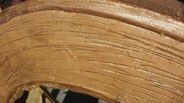 Pintura - rociar toda la pieza con un rociador de la energía de Wagner con pintura de látex. Otra vez es fundamental utilizar agua capas a base de solvente libres de la espuma o derretirá. Una vez que está sellado, entonces puede aplicar la pintura de aerosol. Si tienes un buen presupuesto se puede aplicar un producto por Rosco llamado capa de espuma que le dan un caparazón resistente y evitar que se astille. Sobre la capa base de marrón utilicé varios marrones y dorados. Finalmente me frota el pedazo entero hacia abajo con un esmalte metálico bronce que colocó en la intemperie para dar profundidad.