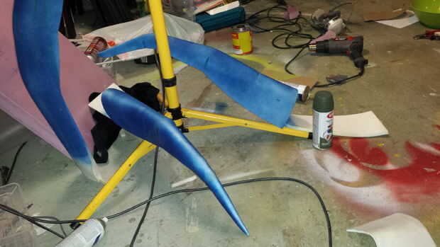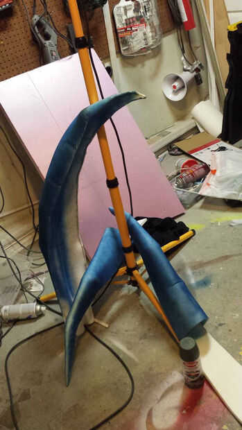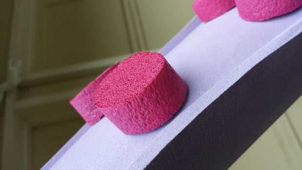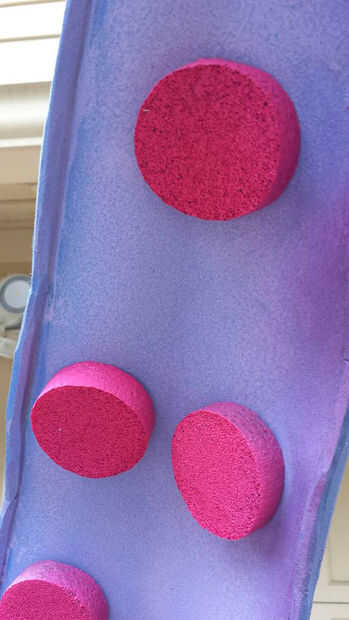 Los ingredientes para esta obra fueron simples. Espuma, cemento de contacto, una pistola y pintura. Yo uso una espuma de goma llamada espuma de polietileno reticulado que viene en diferentes espesores. Yo jugaba con tela dart estilo cortes para obtener la curvatura y forma orgánica. Una vez que se pegan, voy sobre todas las superficies con una pistola de calor para derretir apenas la superficie. La espuma es muy porosa y empapará la pintura indefinidamente a menos que está sellado.
